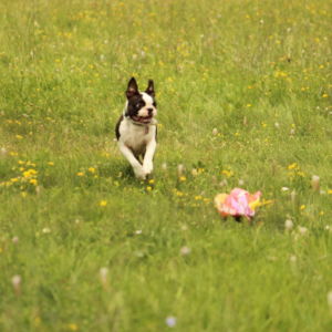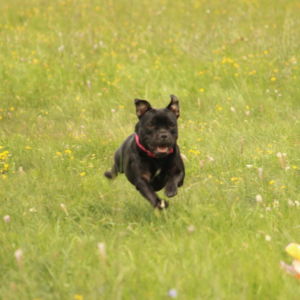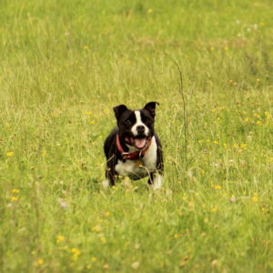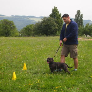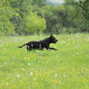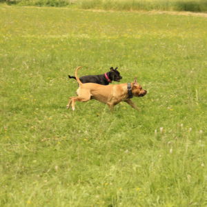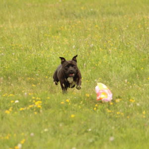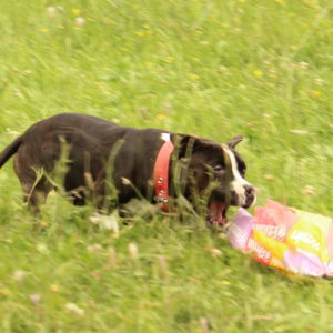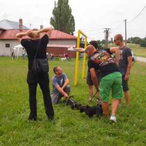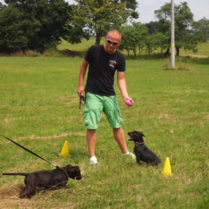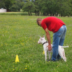 Dlho to vyzeralo, že sa nakoniec táto akcia konať nebude kvôli malému záujmu účastníkov, nakoniec pár dní pre víkendom sa ešte dohlásil potrebný počet psov, aby sme mohli preteky uskutočniť. Ešte ráno to nevyzeralo príliš dobre, o 5,30 h ma zobudil dážď, ale nakoniec sa ukázalo, že „Veľký ovládač počasia“ bude rozhodne kynológ a možno má aj stafíka, pretože počasie bolo nakoniec úplne skvelé, tráva bola vysušená a ani slnko príliš počas pretekov nepieklo, takže naši psi mohli behať, čo im dych, chuť a kondícia dovolila. Nakoniec prišlo 16 psov, z toho 13 stafíkov, 1 boston teriér, 1 pit a 1 bulteriér ( doslova teriér akcia ), jedenásť psov a súk bolo dospelých a prišlo aj päť 4-mesačných šteniat, takže sa mohlo súťažiť v dvoch triedach – dospeláci a šteniatka. Garantom odbornosti a rozhodcom na tejto akcii bola Hana Rajtšlégrová a bola skvelá ! Hlavne sprievodným slovom a tým, že navodila úplne super atmosféru bez zbytočných stresov typu – pôjde nám to alebo si urobíme hanbu ?!? Mala pravdu, teriére sú prirodzení lovci a lákaniu pred nimi sa pohybujúcemu strapcu neodolal nikto, všetci bežali ako o dušu, dokonca dobre dopadli aj záverečné behy vo dvojici, ani náznak agresivity, krásne sa všetci zameriavali na strapec pred nimi, super zvládli aj zákus, jediný bežal s náhubkom nakoniec len náš Bastien, aj to len preto, že viem, že jemu nevadí a majitelia s ním bežiacich feniek mohli byť viac v pohode :).