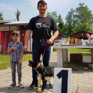 CHS Crazy magic reprezentovali Cloe a Sonet. Zúčastnili sa disciplín A-frame, TOW, WPS ( weight pull sprint ), profi WP a standart WP ( weight pulling ). Najlepšie sa zadarilo v pullingu a a-frame, skvelé víťazstvá vo výbornej konkurencii v profi a standart pullingu pre Soneta a víťazstvo Cloe v standart pullingu patria medzi najväčšie výsledky v bull športoch pre Crazy magic. Delené 4.-5. miesto v a-frame za 32 skokov za min. je pre psa formátu Soneta tiež nesporným úspechom. Hlavne výsledok Cloe je fascinujúci, lebo sa zrodil vo výbornej konkurencii, na jej druhej súťaži a treba spomenúť ako zaujímavosť, že sa jedná o najlepšieho SBT na SK výstavách za r. 2018 a šampióna krásy Slovenska, víťaza viacerých výstav aj s umiestnením v záverečnom kruhu. Takže delenie stafíkov na výstavné a športové línie dostal dokonale na ….. frak :). Ide o povahu a srdce bojovníka ! Ďakujem organizačnému tímu Elite Bull Cup-u a súperom za skvelé a hlavne férové súboje v priateľskom, vzájomneprajúcom duchu, aký sa málokedy vidí na výstavách … Bolo mi potešením, PRIATELIA !