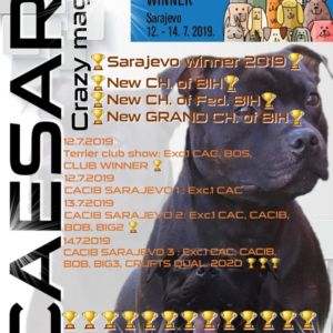 Caesar CM ( Aston Rascal Bull x Jetta Crazy magic ) – 4xCAC, 2xCACIB, 2. a 3. miesto BIG, Gruft´s Qualification, Šampión krásy Bosny a Hecegoviny, Šampión krásy Federácie Bosny a Hecegoviny, Grand Šampión krásy Bosny a Hecegoviny, Sarajevo Winner 2019 a BKS Club Winner 2019, 2. miesto o najlepší pár z 5 a 1. chovateľská skupina. Paráda ! A k tomu splnené podmienky na Interšampióna krásy.