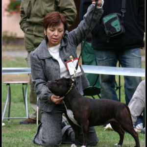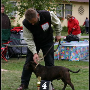Posudok: 10 měsíční žíhaný pes, velmi pěkné síly kostry, s hezky utvářenou hlavou, tmavým okem, dobře složeným, ale trochu delším uchem, měkší hřbet za kohoutkem, standartní pohyb i úhlení obou párů končetin.