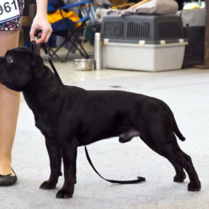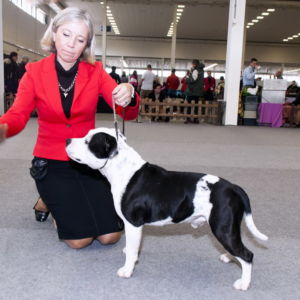 Medzinárodná výstava psov Nitra, 10.1.2015 – rozhodca : MVDr. Stanislav Bučko, SK – výstava, na ktorej nás reálne po dlhšej dobe reprezentovalo viac súk ako psov, začíname viac vystavovať naše juniorky Paris a Ritu, ktorá mala v triede mladých premiéru, pokúsili sme sa ukončiť šampionáty Nestora a pre Chiaru, prvýkrát sa na výstave objavila Oxy. Navyše táto výstava bola naozaj kvalitne obsadená, stafíci boli aj tretím najpočetnejším plemenom na výstave, ale hlavne kvalita psov v jednotlivých triedach bola na dobrej úrovni . Nestor mal v triede strednej troch súperov, ale veľmi kvalitných, veď s Indian Scout Moravia Lord sa stretol vo vyrovnaných súbojoch už viackrát, navyše tento syn svetového víťaza mladých Easy Rider ML rastie na obraz svojho otca, tiež Dark White Staff Haven ( syn Trufflestaff Bonity Bohani – brat veľmi slávnej Trufflestaff Monifa Kanika ) má za sebou viac výborných výsledkov v ČR, Brett Poker Canis tiež kvalitou nezaostával… A v tejto zostave sa podarilo Nestorovi vyhrať a splnil podmienky na zisk Šampióna krásy Slovenka, v ďalšom súboji s víťazom triedy otvorenej Avallonom Rascall Bull a víťazom triedy šampiónov Double Cheese Top Banana získal Res.CACIB. Juniorkám sa darilo trošku menej, Paris skončila na štvrtom mieste z piatich súk s hodnotením Veľmi dobrá, Rita v svojej premiére bojovala o prvé miesto, ale hlavne kvôli menej výraznému predvedeniu v pohybe skončila druhá, čo vôbec nie je zlé, keď zoberieme, že za ňou skončila jej výrazne skúsenejšia sesternica Justyna My Love Moravia Lord ( dcéra Bloody Mary Moravia Lord a slávneho anglického Ashstock Red Miller ). Veľmi ma prekvapila výsledkom Oxy, ktorá v premiére a po krátkom tréningu bola výsledkovo pred Energy Miracle Bulls – druhá z Európskej výstavy psov v triede mladých, pred veľmi peknou poľskou Vena Ale Heca (dcéra úspešného Sikaistaff Dark Lord ) a pred dcérou svetového víťaza mladých Incroyable Jolie Moravia Lord, naozaj vyhrala veľmi ťažkú triedu. Podobne ma v dobrom šokla Chiara v otvorenej, keď bola pred dvoma dcérami anglických otcov a hlavne Bully for you Top Banana je suka, ktorá už má za sebou pár výrazných výsledkov. Víťazom plemena sa stal Double Cheese Top Banana, titul BOS ( najlepšia suka ) získala Andorra La Vella Rascal Bull. Na túto výstavu bolo prihlásených 34 stafíkov, z toho 10 slovenských odchovov, 6 z Crazy Magic, 3 z Rascal Bull, 1 z Jayo Staff, 22 českých, 1 anglický a 1 maďarský odchov.
