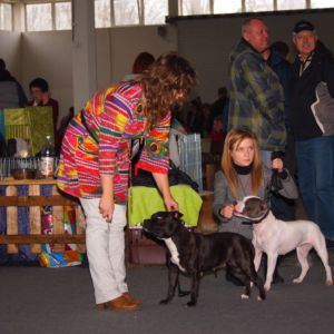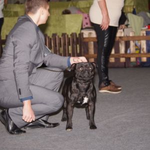 Medzinárodná výstava psov Nitra, 01.3.2015 – rozhodca : Malo Alcrudo Rafael, ESP – na tejto výstave boli prvýkrát po dlhšej dobe Ozembuch, bol som zvedavý ako mu to pôjde, zároveň to bola pravdepodobne posledná Chiarina výstava … Tentoraz som vystavoval po dlhšej dobe ja, Sonet sa oproti včerajšku zlepšil, bol zo 6 prihlásených psov Výborný 2, Ozembuch po slušnom predvedení získal Výborný 3, Nestor v šampiónoch prehral s neskorším Res. CACIB-om na tejto výstave Casperom Black Machine a získal Výborný 2, Res.CAC. Znova boli výborné mladé suky a v triede obsadili opäť prvé dve miesta z piatich prihlásených súk, Rita – Výborná 1, CAJC a Paris – Výborná 2. A potom prišlo pre mňa to hlavné na tejto výstave :), Chiara bola z 3 prihlásených súk Výborná 1, CAC v triede otvorenej a na svojej poslednej výstave splnila podmienky na zisk titulu Slovenský šampión krásy vo veku 4,5 roka, pričom na svojej prvej výstave bola ako trojročná, len tak si to vyskúšať :). SUPER ! Víťazom plemena sa stala opäť krásna Ch. Andorra La Vella Rascal Bull. Na túto výstavu bolo prihlásených 34 stafíkov, z toho 8 slovenských odchovov, 5 z Crazy Magic a 3 z Rascal Bull, 21 českých, 1 anglický, 1 rakúsky, 2 poľské a 1 maďarský odchov.
